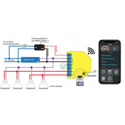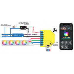 Shelly RGBW obsługuje dowolne paski led 12v lub 24v White, RGB, RGBW i żarówki led 12/24v, z łączną mocą do 288W.